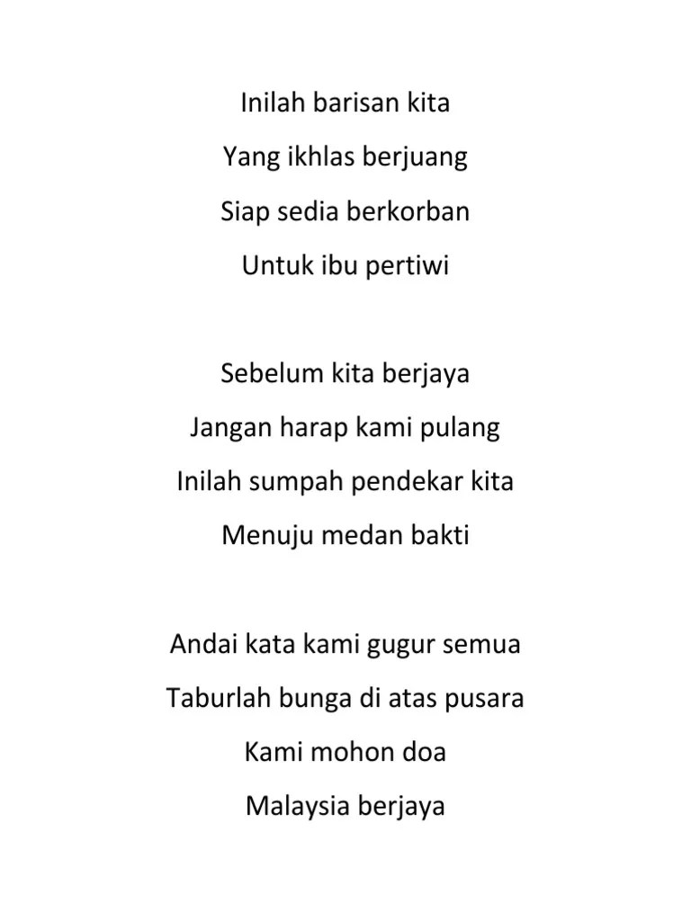 Malaysian patriotic songs (lagu patriotik malaysia) liedtext: Patriotik malaysia, lyrics :inilah barisan kita yang ikhlas berjuang siap sedia berkorban untuk ibu pertiwi sebelum kita berjaya jangan harap kami . Translation of 'inilah barisan kita' by malaysian patriotic songs (lagu patriotik malaysia) from malay to english (version #2) | smule social singing karaoke app. Inilah barisan kita c g yang ikhlas berjuang e am siap sedia berkorban e am untuk ibu pertiwi a am e sebelum kita berjaya am a dm jangan . Inilah barisan kita, / yang ikhlas berjuang. Inilah barisan kita (lyrics) inilah barisan kita yang ikhlas berjuang siap sedia berkorban untuk ibu pertiwi sebelum kita berjaya jangan .